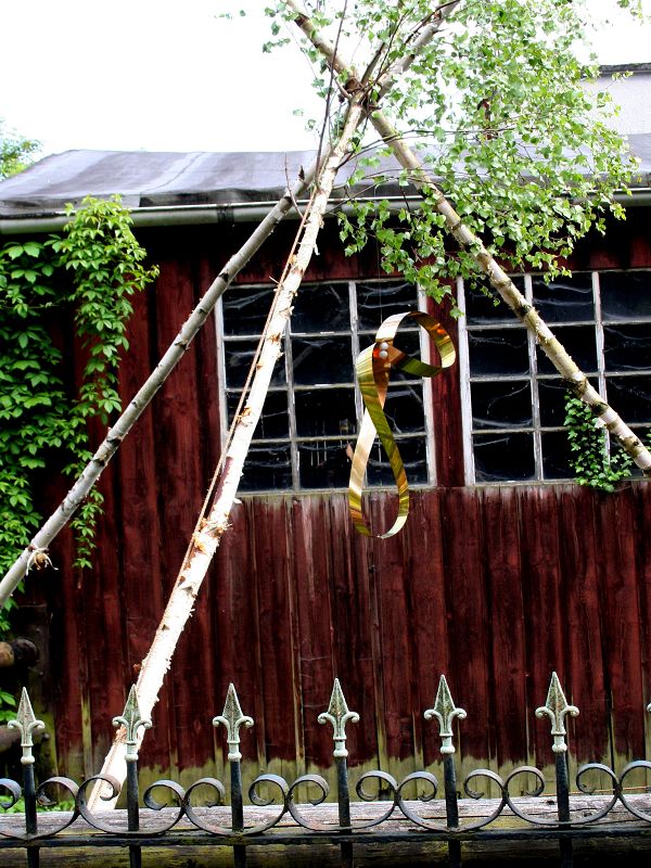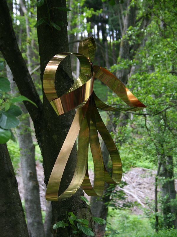 Vorstudien zu dieser Plastik entstanden in den vergangenen zwei Jahren in Edingers Atelier in Düsseldorf und sind als Modelle in der Kunstausstellung im Alten Sägewerk in Katzenloch zu sehen. Eine neue Skulptur präsentiert der 60-Jährige mit „beschwingter Heiterkeit“ seit einigen Tagen als beweglichen Blickfang gegenüber dem Wasserfall. Unter einem Dreibein aus Birkenhölzern bewegt sich eine „Zeitschleife“ aus geschwungenem, im Licht blitzendem Metall. Bewegt vom Wind und der vom Wasser ausgehenden Thermik werden die „mit Luft umschlossenen Räume“ in Bewegung gehalten: „Sie verändern sich, sie lösen sich, sie bilden neue temporäre Räume und regen die Fantasie des Betrachters an. Das Gesamtbild der Installation hat eine geometrische Ordnung und besteht aus sieben Dreiecken. Darunter fließt das Wasser und damit die Zeit.“
